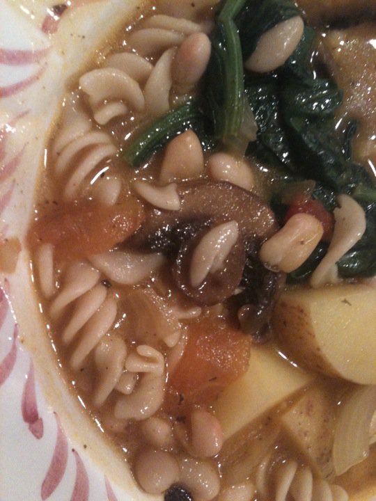 4. When you are just about ready to serve the soup, you can add in the beans and greens. Adding the last keeps them tender and not mushy. If you want your greens a bit more hearty, use kale or collard. Spinach wilts very easily.